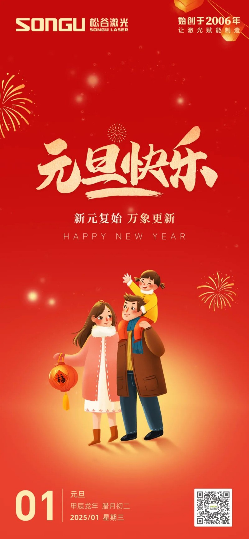 隨著歲月的腳步悄然邁進(jìn),我們滿懷激動(dòng)與憧憬,共同迎來了充滿希望的2025年元旦。在這個(gè)辭舊迎新的美好時(shí)刻,松谷激光科技向全體員工、合作伙伴以及一直以來給予我們支持與信任的朋友們致以最誠摯的祝福和最深切的感謝!