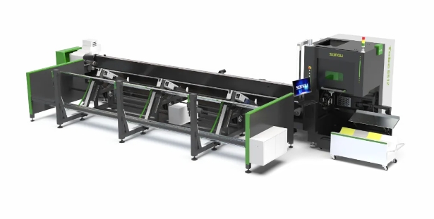 龍門式橫梁結(jié)構(gòu),高動(dòng)態(tài)性能,高剛性,切割精度高,穩(wěn)定性好;標(biāo)配氣動(dòng)漸變凹輪輔助支撐,避免管材自重下垂,減小變形,提高切割精度;前卡避讓短尾料切割,實(shí)現(xiàn)更短尾料切割;全自動(dòng)潤(rùn)滑系統(tǒng),定時(shí)自動(dòng)供油,無需人工干預(yù);模塊化設(shè)計(jì),可選配不同的上下料方式,根據(jù)客戶實(shí)際生產(chǎn)需求自由組合擺放。